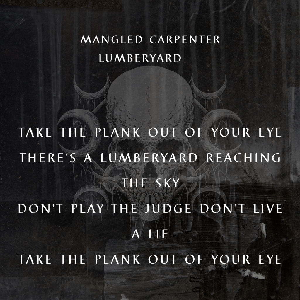 From “Lumberyard” by Mangled Carpenter “Take the plank out of your eyeThere’s a lumberyard reaching the skyDon’t play the judge don’t live a lieTake the plank out of your eye”